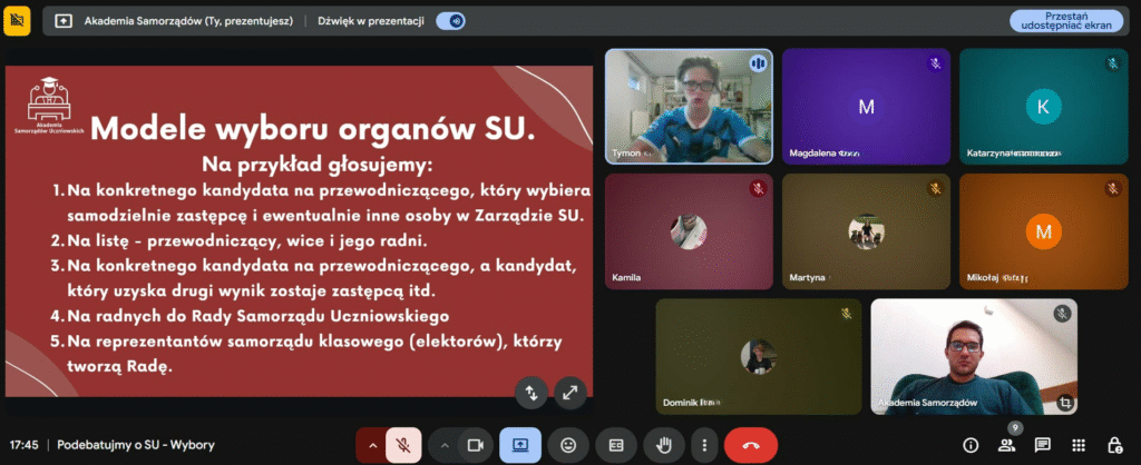 W czwartek, 2 października, spotkaliśmy się online z członkami SU, kandydatami oraz opiekunami samorządów, by wspólnie porozmawiać o wyborach do samorządów uczniowskich – ich przebiegu, wyzwaniach i dobrych praktykach.